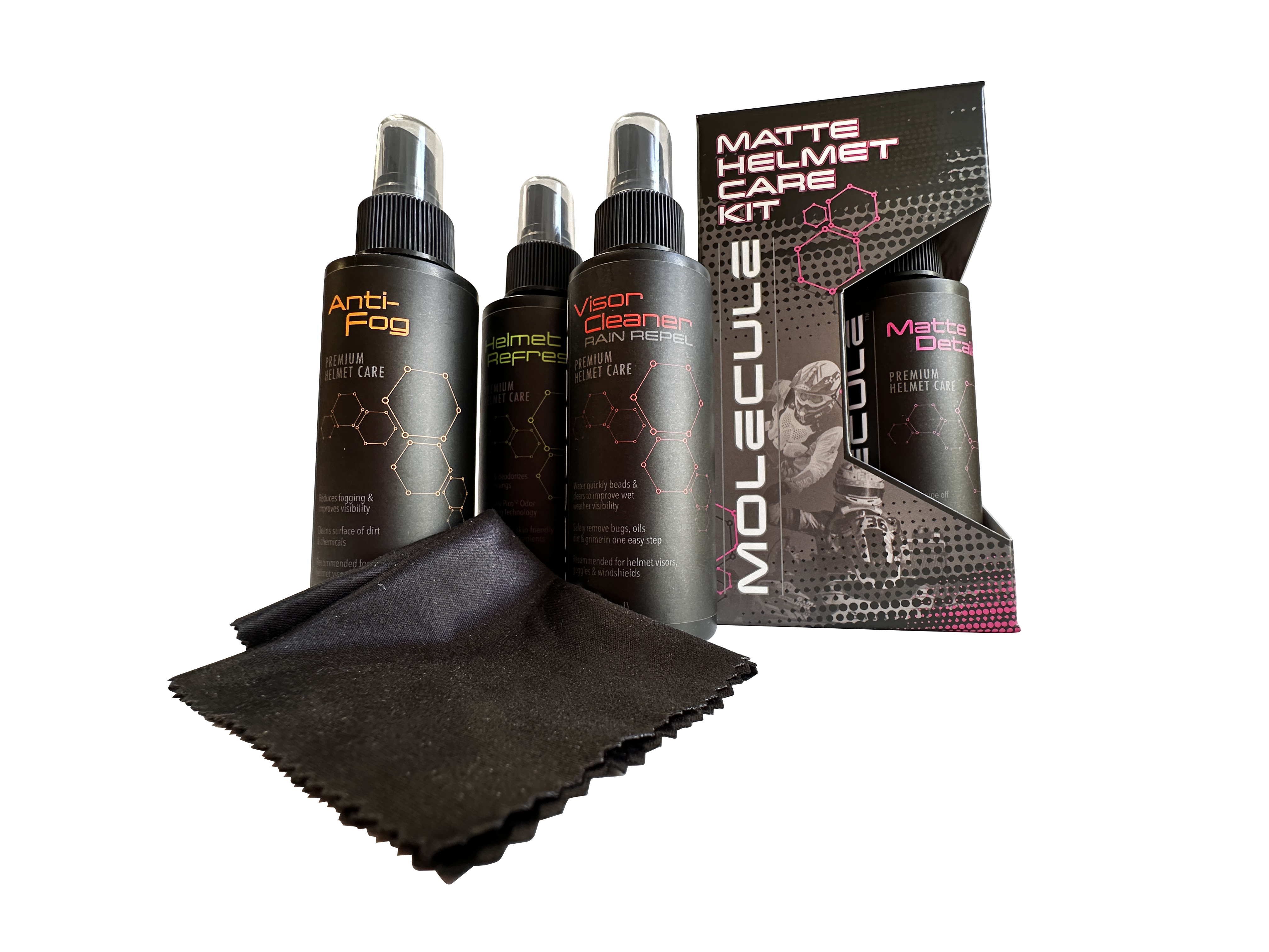 MOLECULE HELMET CARE KIT is a bundled kit for all your helmet care needs. HELMET REFRESH to keep the inside of helmet clean. CLEANER POLISH in one spray designed to keep helmets clean, shining and protected. Safe to use on finishes, visors, including flat and matte. ANTI-FOG to keep the inside of visor clear. RAIN REPEL on outside of visor. Includes microfiber towel to keep your helmet fresh and clean.
