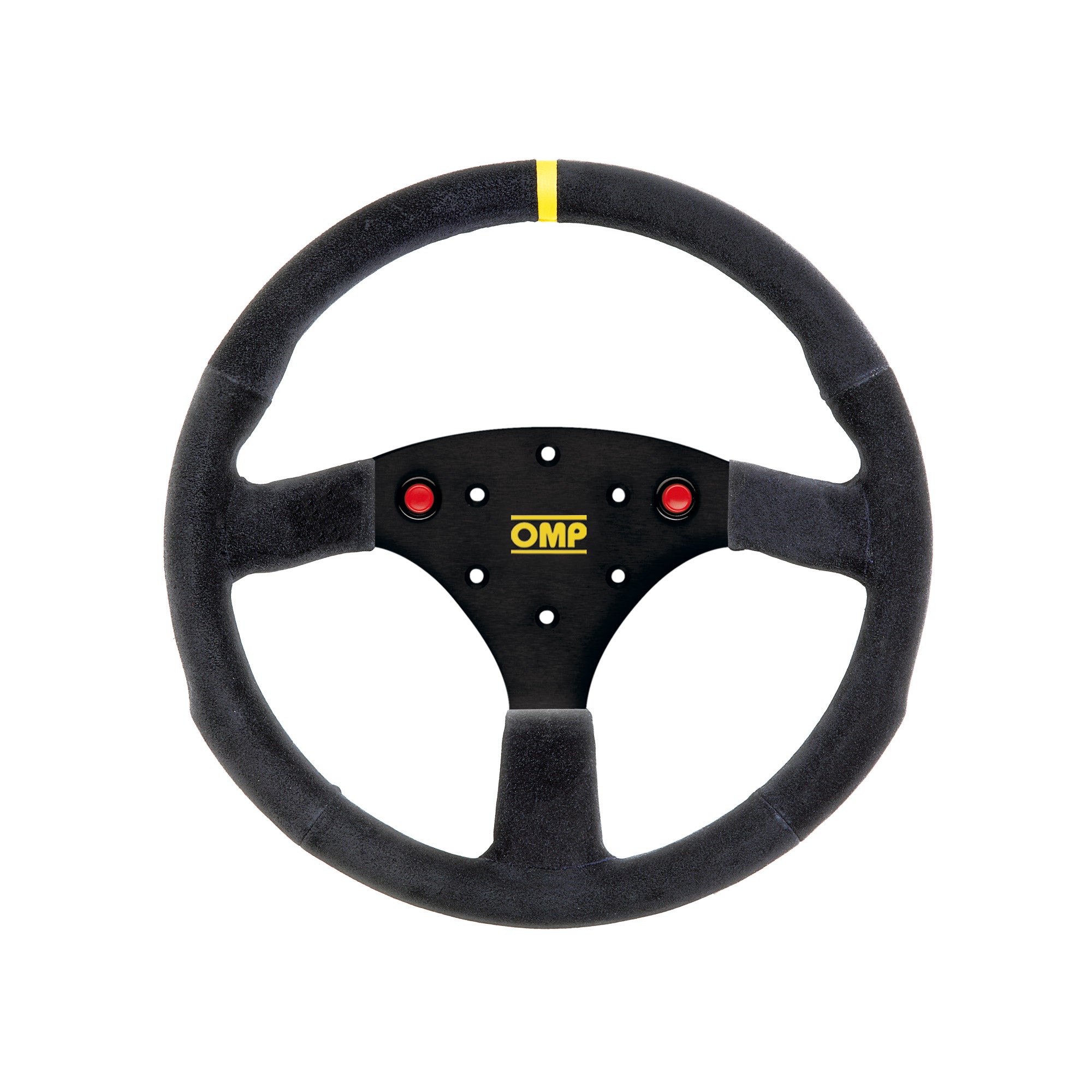 Three spokes flat aluminium steering wheel in suede leather. Shaped handgrip and spokes to improve driving feeling and comfort. Two red buttons mounted on horizontal spokes controlling two separate accessory switches (for example one for horn and the other for highbeams).