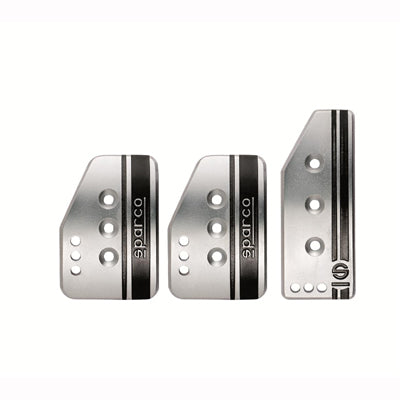 The Settanta pedal set is designed to coordinate the Settanta and Settantra R shift knobs, and hand brake cover. It features contrasting vertical indented lines and perforations for added grip. Each pedal is accented with an engraved Sparco logos. Available in two color ways: black with orange and white accents or silver with black and white accents.